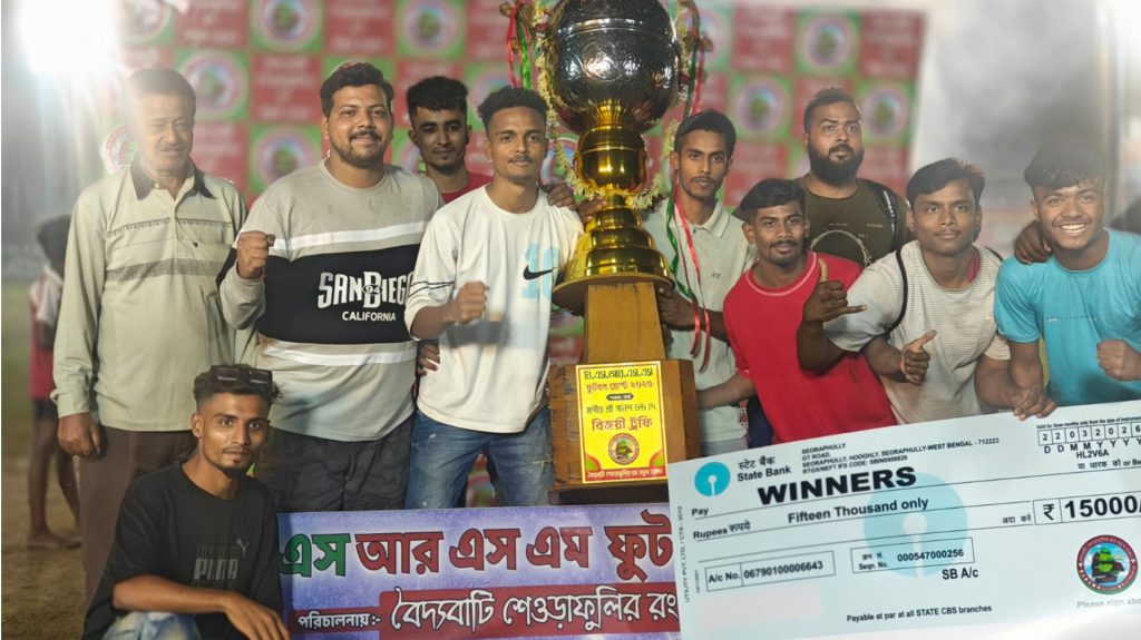 রে স্পোর্টজ ওয়েব ডেস্ক: ‘বৈদ্যবাটি-শেওড়াফুলির রং সবুজ মেরুন’ ক্লাবের উদ্যোগে জমে উঠেছিল ১৬ দলীয় দিবারাত্রি নকআউট ফুটবল টুর্নামেন্ট। সবুজ-মেরুন আবেগে ভরপুর এই প্রতিযোগিতায় অংশ নেয় ১৬টি মোহনবাগান ফ্যান্স ক্লাব। টানটান উত্তেজনার ফাইনালে আন্দুল মেরিনার্স ১-০ গোলে হারায় মেরিনার্স অনসাইডকে এবং চ্যাম্পিয়নের শিরোপা জিতে নেয়।হাড্ডাহাড্ডি লড়াইয়ের ম্যাচে একমাত্র গোলেই ফয়সালা হলেও নজর কাড়েন রানার্স দলের অভিষেক চক্রবর্তী, যিনি নির্বাচিত হন প্রতিযোগিতার সেরা খেলোয়াড়। ফাইনালের আগে আকর্ষণীয় আতসবাজির প্রদর্শনী উৎসবের আবহ আরও বাড়িয়ে তোলে।এই আয়োজনকে ঘিরে উপস্থিত ছিলেন প্রাক্তন ফুটবলার স্বরূপ দাস ও সুজিত নিয়োগী, প্রাক্তন ফিফা রেফারি গোপীনাথ পাইন, ইউনাইটেড স্পোর্টসের কর্তা নবাব ভট্টাচার্য, ‘বর্তমান’ পত্রিকার সাংবাদিক শিবাজী চক্রবর্তী এবং মোহনবাগান এক্সিকিউটিভ কমিটির সদস্য সঞ্জয় ঘোষ।শুধু টুর্নামেন্ট আয়োজনেই সীমাবদ্ধ থাকেনি ‘বৈদ্যবাটি-শেওড়াফুলির রং সবুজ মেরুন’। এলাকার ফুটবল উন্নয়নের লক্ষ্যেও গুরুত্বপূর্ণ পদক্ষেপ নেয় তারা। ছয়টি কোচিং ক্যাম্পকে দেওয়া হয় দুটি করে ফুটবল এবং ১৫ জন ক্ষুদে ফুটবলারকে তুলে দেওয়া হয় ফুটবল কিটস।সব মিলিয়ে মাঠের লড়াইয়ের পাশাপাশি সামাজিক দায়বদ্ধতারও উজ্জ্বল দৃষ্টান্ত স্থাপন করল এই উদ্যোগ।
